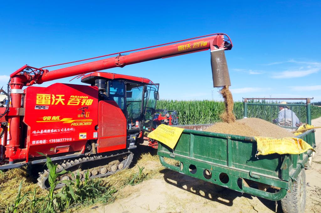 临河区狼山镇万亩硬质小麦绿色高产高效示范园区收获小麦。新华社记者李云平 摄